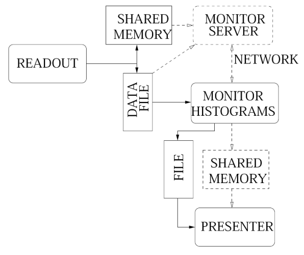 The software for the configuration of the hardware, the readout and for the local data storage has been developed. Also, a simple monitoring is possible, but not yet in real-time. The current status and future plans of the monitoring system are shown in Figure 3.